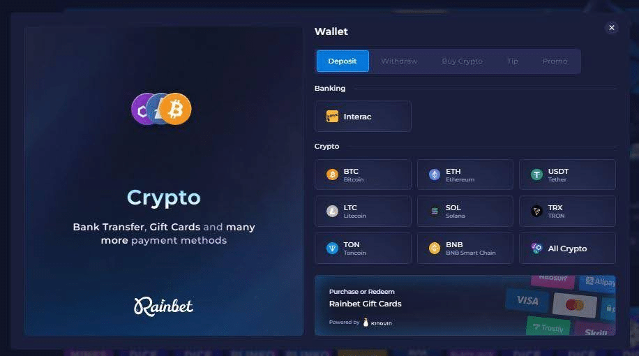 Go to Cashier → Deposit, select your method, enter the amount, and follow the instructions.